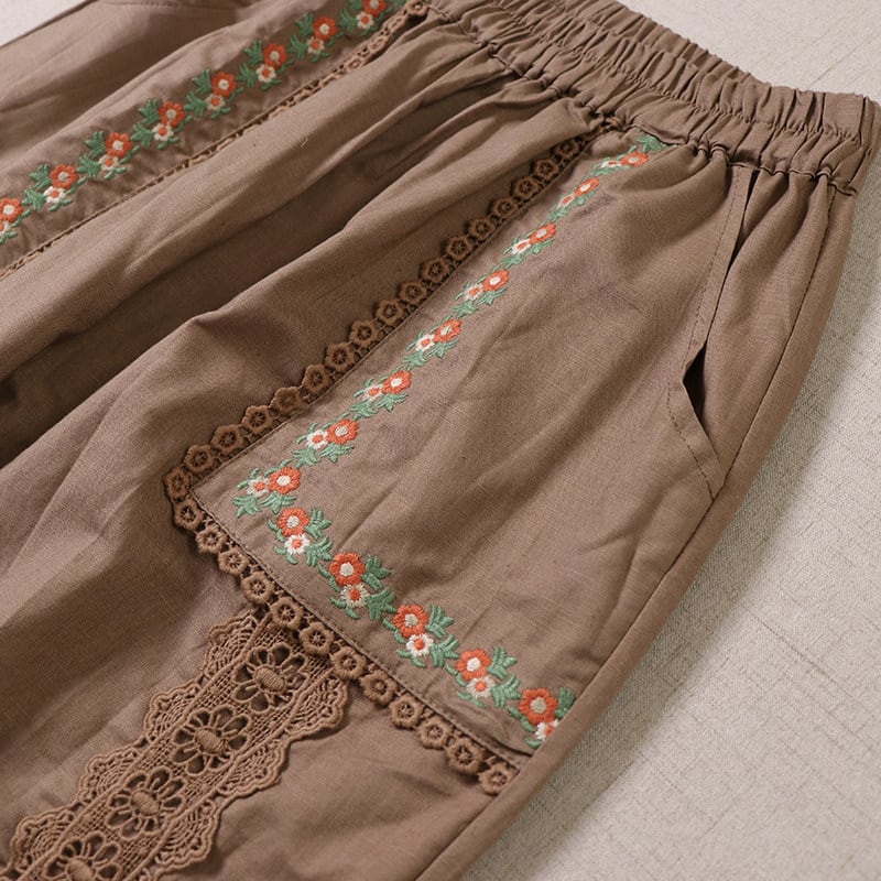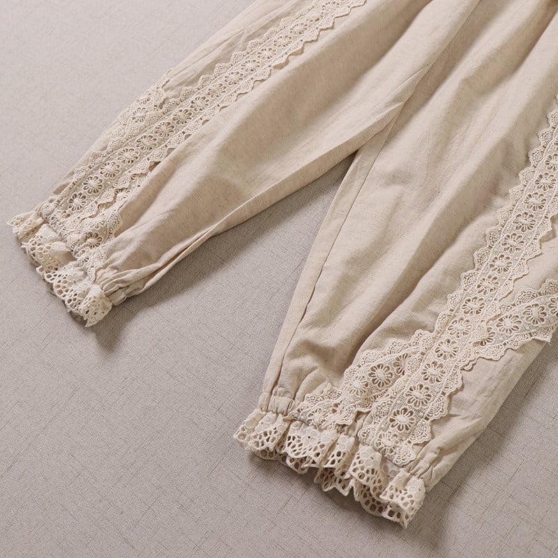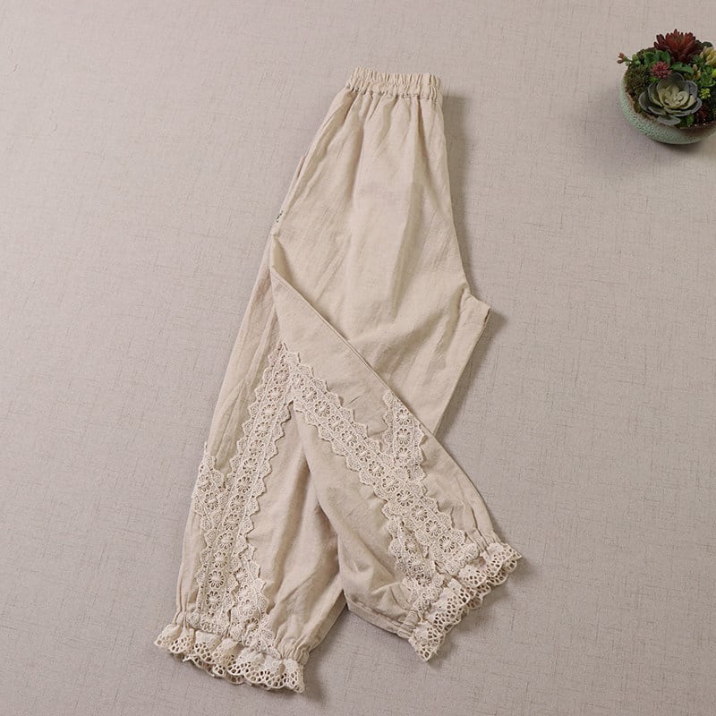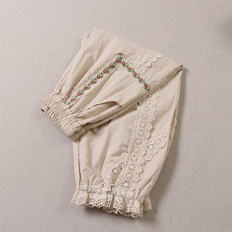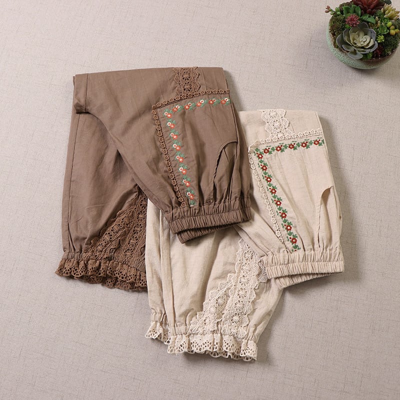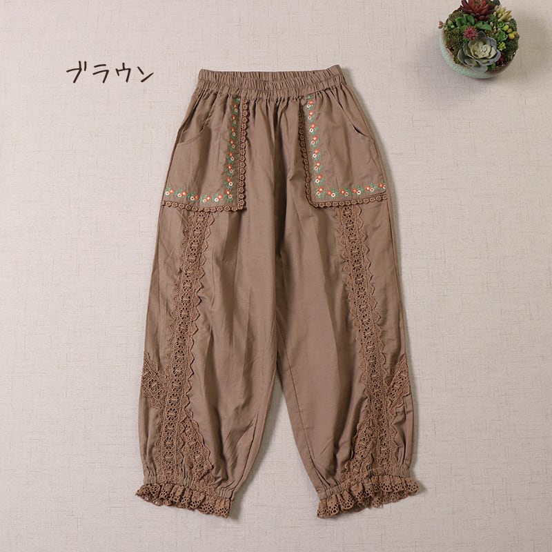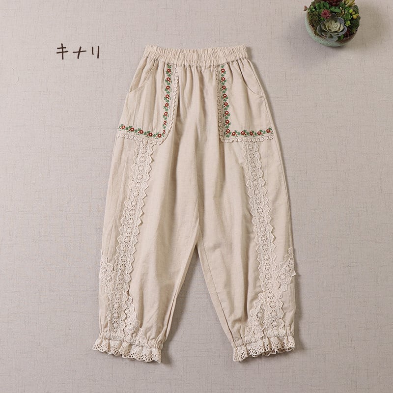 ポケット刺繍とレース切替がポイントの、2色展開のナチュラルパンツです。