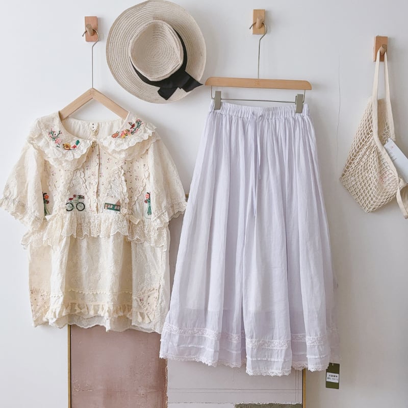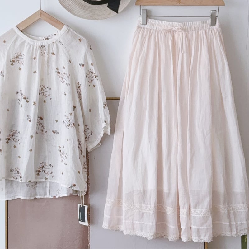 小花柄ブラウスをふわりと重ねれば森の散歩道のような雰囲気が広がり、白い靴下や革のフラットシューズを合わせると素朴な甘さが静かに整います。