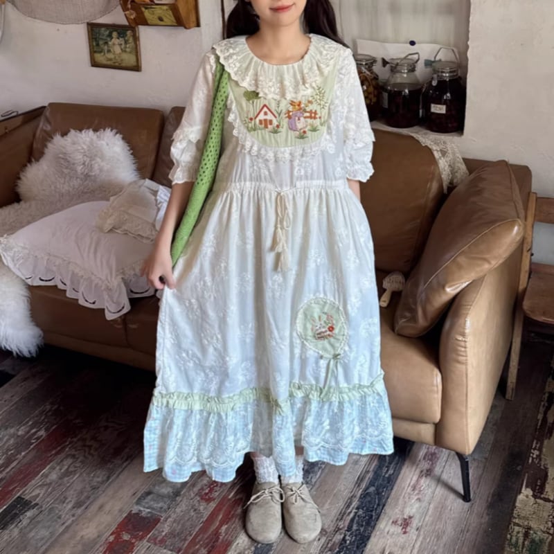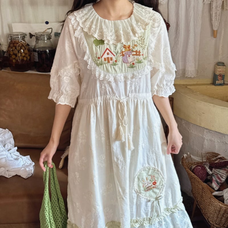 刺繍の風景モチーフが印象的なワンピースです。