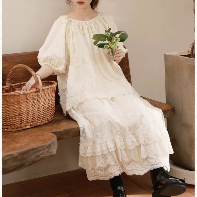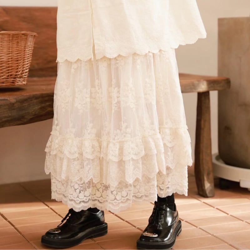 小花柄ブラウスをふわりと重ねれば森の散歩道のような雰囲気が広がり、レース靴下や革のフラットシューズを合わせると素朴な甘さが静かに整います。