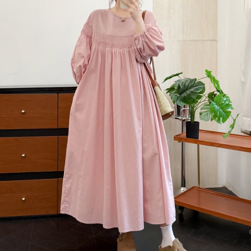 ギャザーの陰影が印象的なクラシックワンピースです。