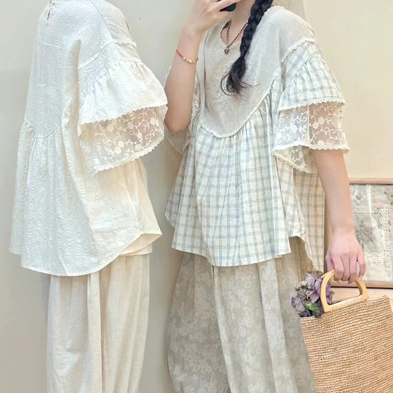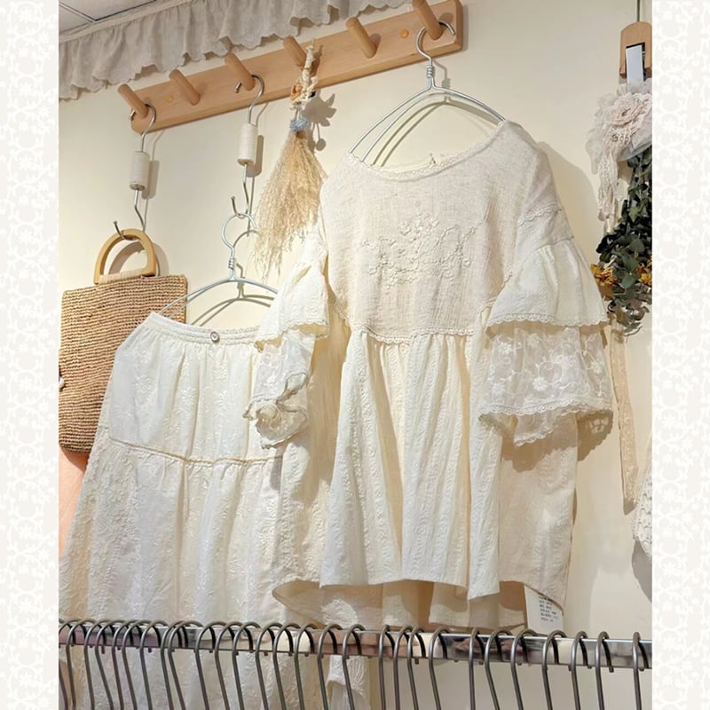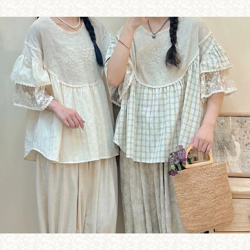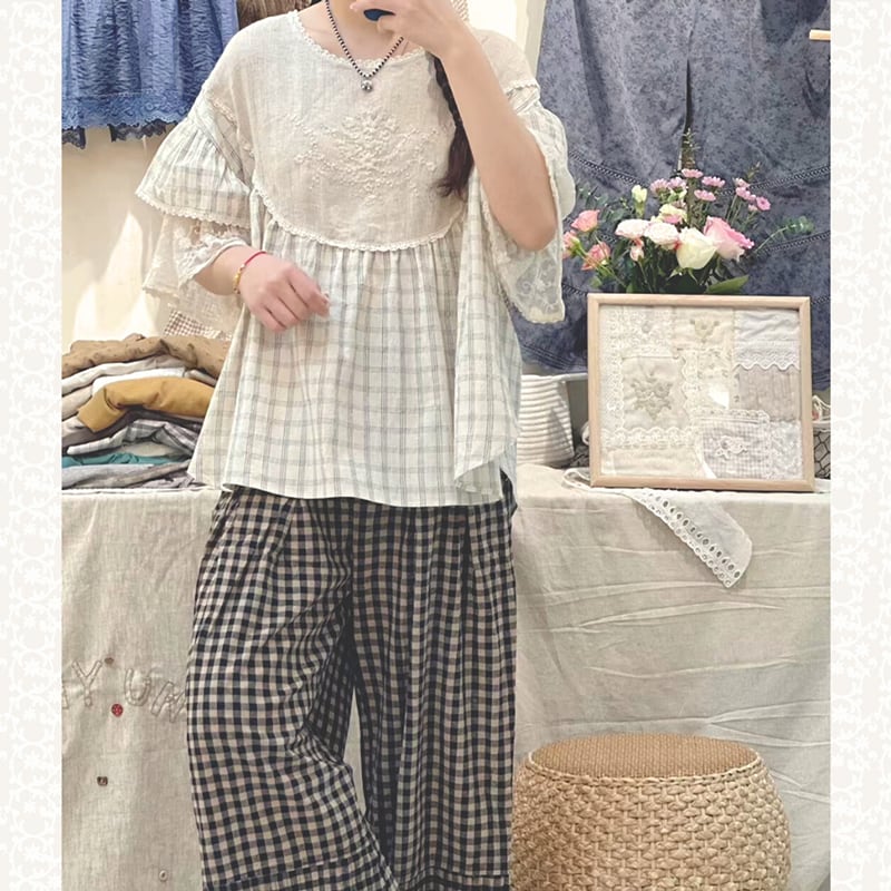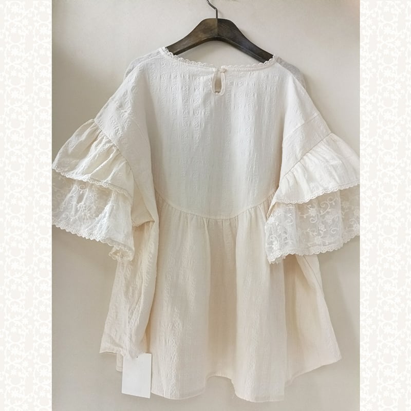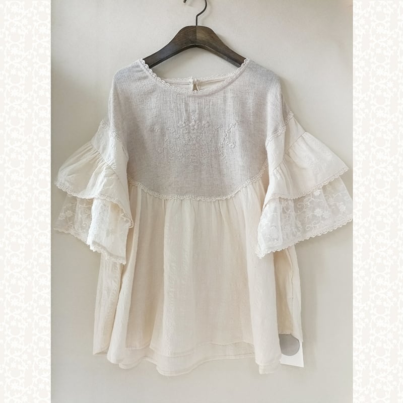 レース二層スリーブ刺繍リネンシャツ W0587
