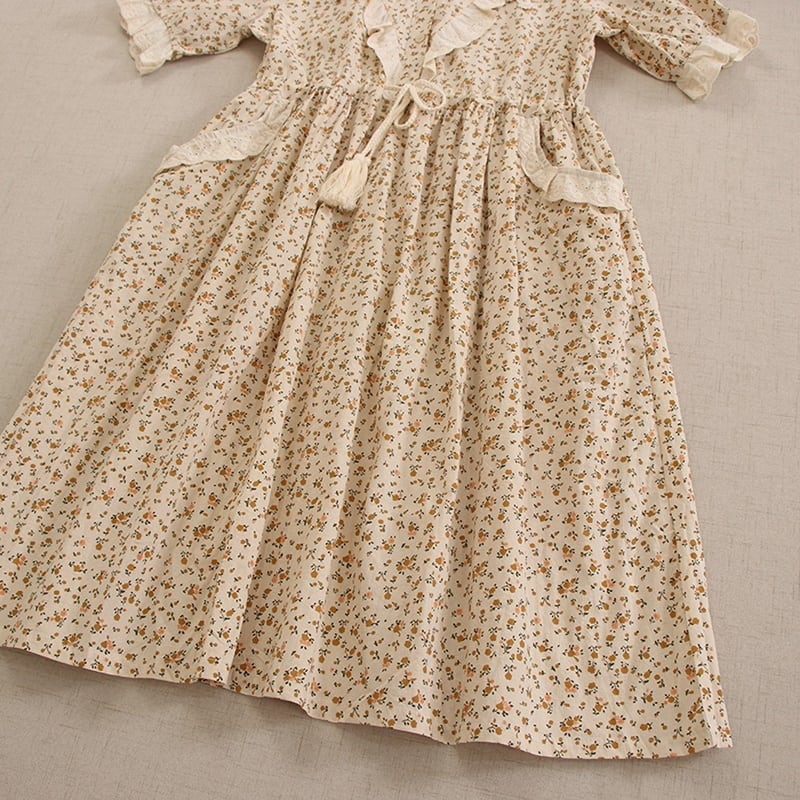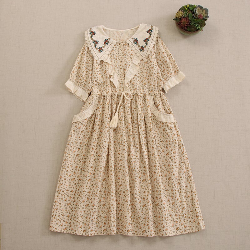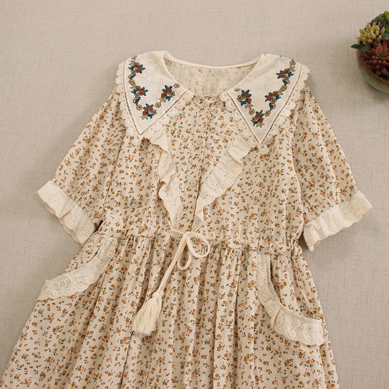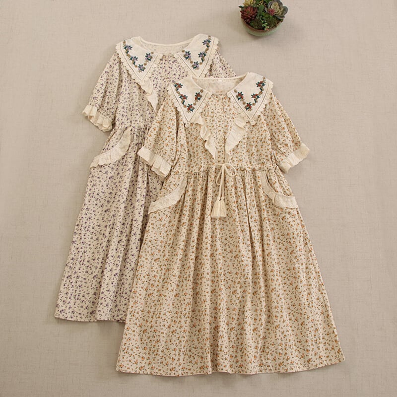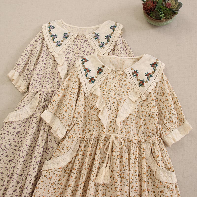 カラー花柄ポイントデザイン刺繍ドローストリングワンピース W0722