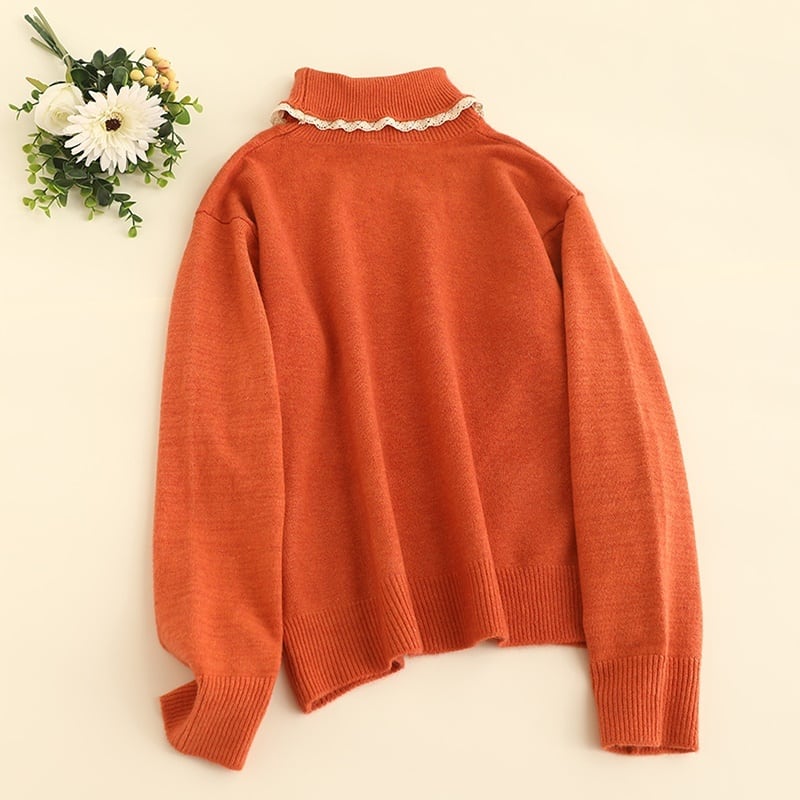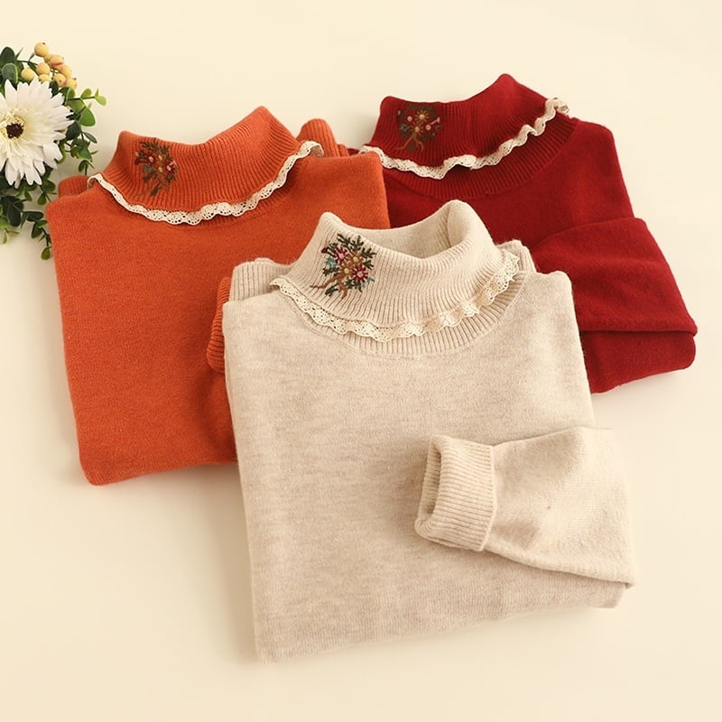 タートルネックお花刺繍レーススリムフィットセーター W1017