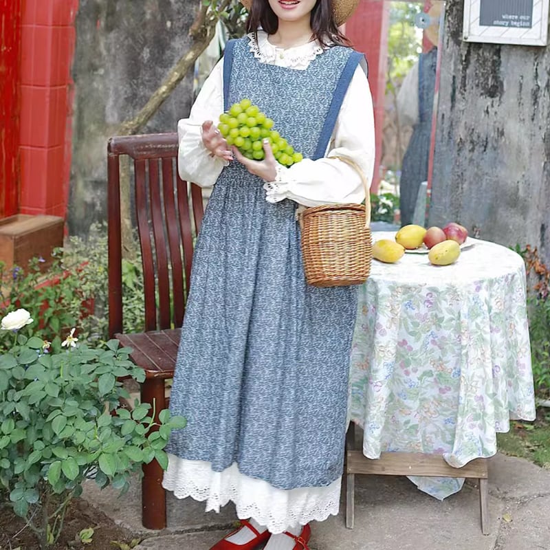 クラシック花柄ダブル裾レースエプロンワンピース W1108