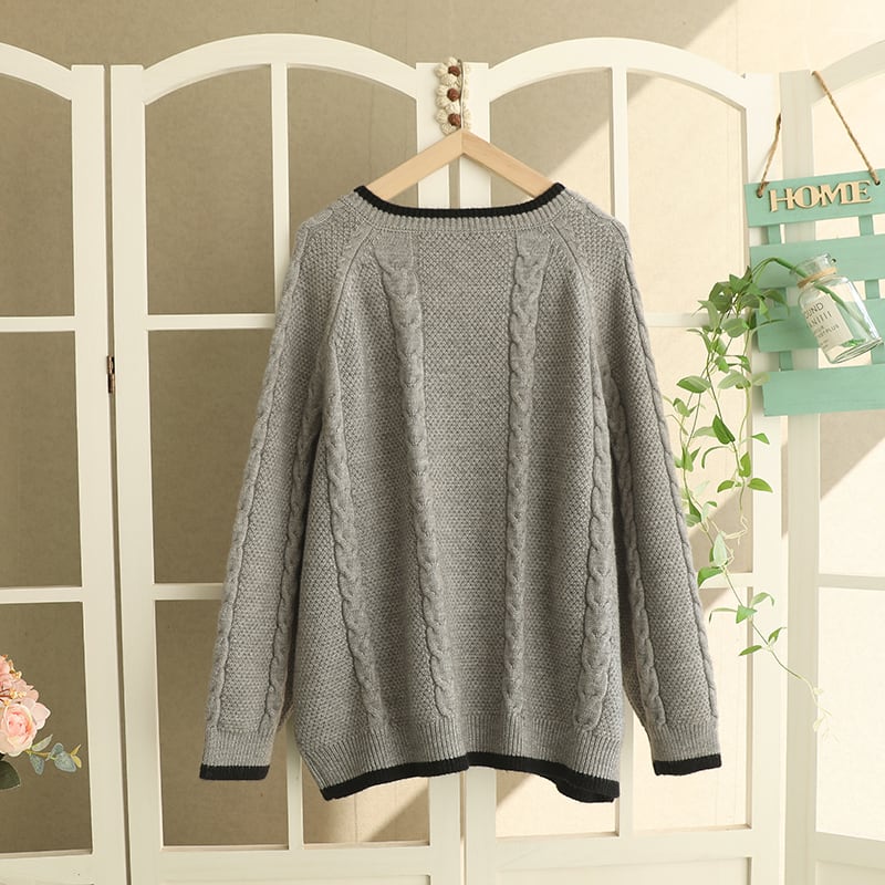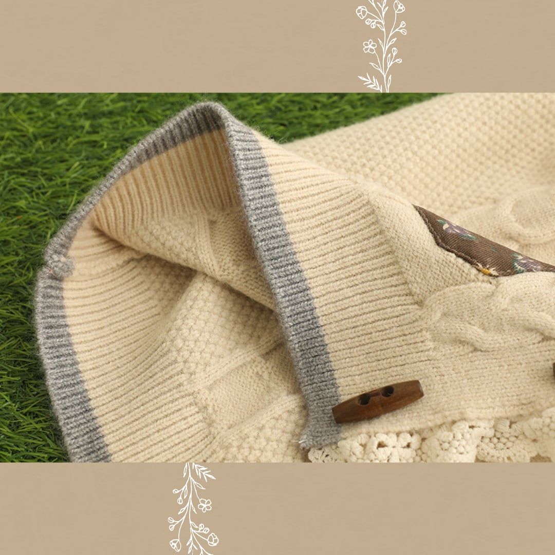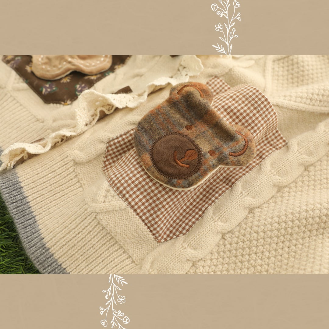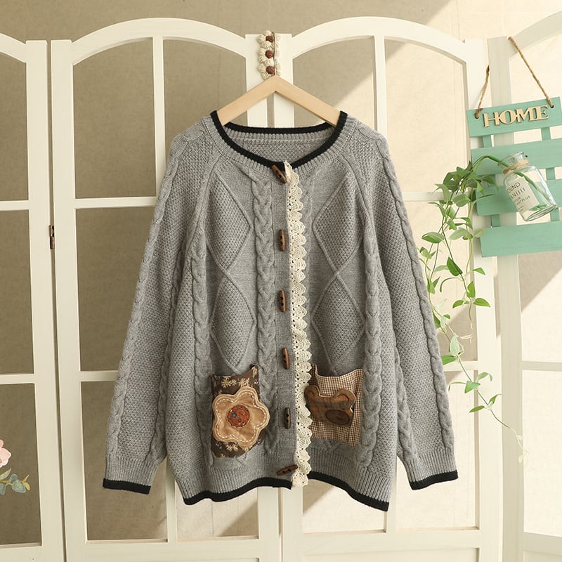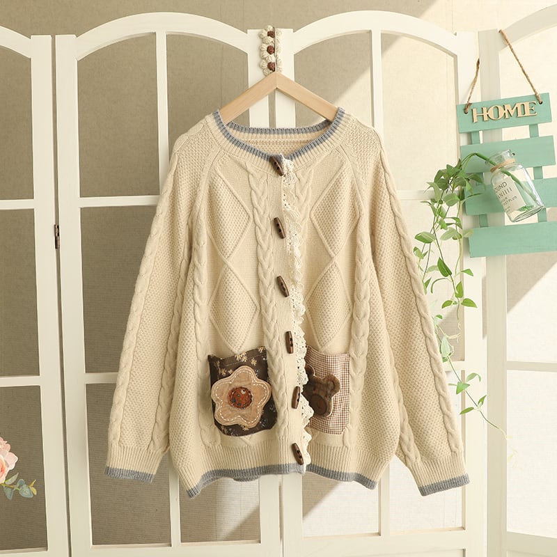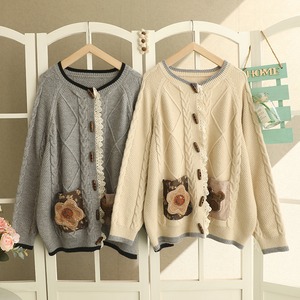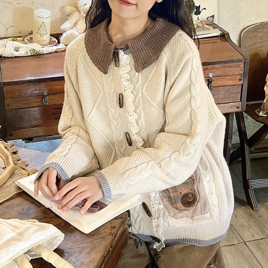 ケーブル編みくまデザインラウンドネックニットカーディガン W1129